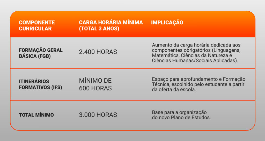 Tanto a Lei Federal quanto a Resolução CEEd/RS nº 385/2025 ampliaram a carga horária da FGB para 2,4 mil horas, no mínimo, e, ao menos, um mínimo de 600 horas de Itinerário Formativo com ênfase nos aprofundamentos. Além disso, a Resolução chama a atenção que os Itinerários Formativos de Aprofundamento (IFAs) sejam organizados em Projetos Interdisciplinares e Integradores. Os componentes curriculares eletivos, caso sejam ofertados pela escola, somente poderão ser ofertados a partir de 3 mil horas.