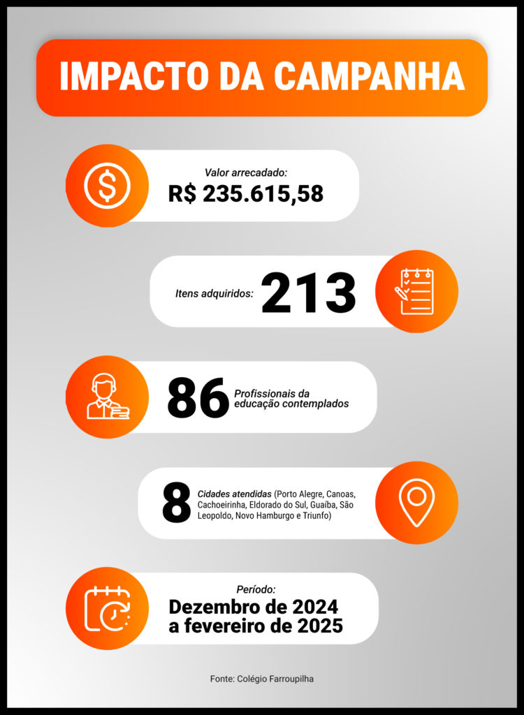 O Farroupilha mapeou cerca de 20 profissionais internos atingidos, que foram ajudados com recursos próprios. Já a campanha voltada ao público geral recebeu 600 inscrições, envolvendo profissionais tanto da rede pública quanto da privada. Grace ressalta que houve o cuidado de incluir ambos os setores, combatendo a ideia de que apenas profissionais da rede pública necessitam de apoio, já que as condições de vulnerabilidade podem variar independentemente do tipo de instituição.