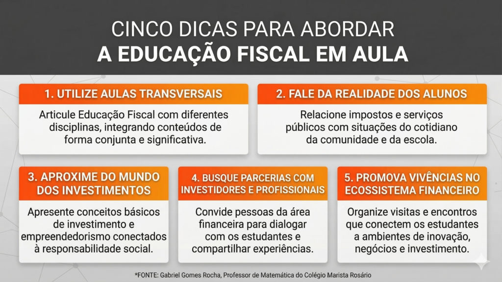O professor de Matemática do Colégio Marista Rosário, de Porto Alegre, Gabriel Gomes Rocha, conta que a escola desenvolve dois projetos no Ensino Fundamental e no Ensino Médio que abordam a relação entre finanças, impostos e serviços públicos. São eles: o Itinerário Formativo de Aprofundamento em Educação Financeira, voltado ao Ensino Médio, e o Clube de Educação Financeira, destinado ao Ensino Fundamental.
