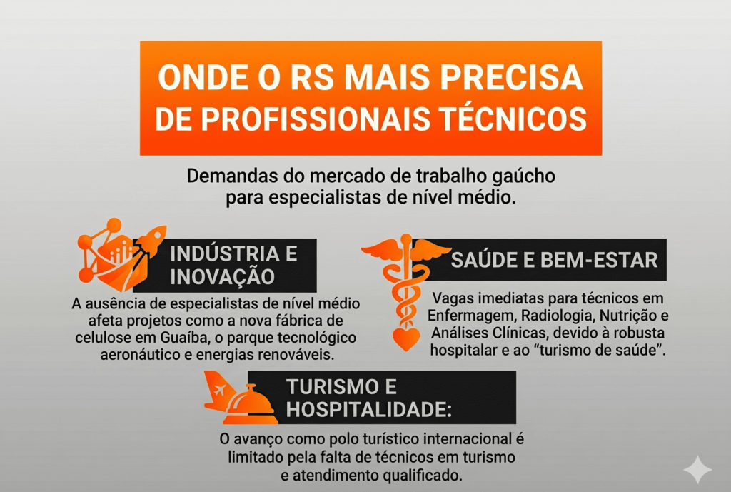 O cenário industrial também apresenta lacunas expressivas na formação técnica para novos empreendimentos de grande porte. O diretor comenta que projetos como a segunda fábrica de celulose em Guaíba, a construção de um parque tecnológico aeronáutico e os investimentos em energias renováveis enfrentam a ausência de profissionais de nível médio técnico.