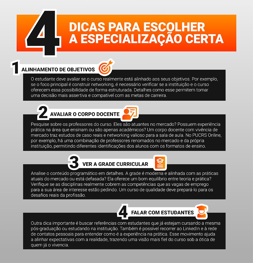 A consultora de carreira e líder de projetos do PUCRS Carreiras, Ana Cecília Santiago Petersen, destaca que, com o aumento no número de brasileiros conquistando o diploma universitário, cursar uma especialização se tornou um trunfo importante para se destacar no mercado de trabalho. Ela frisa que a especialização é vista não apenas como vantagem salarial, mas como prova de compromisso com o aprendizado contínuo, alinhado ao conceito de lifelong learning (aprendizado ao longo da vida, em tradução livre).